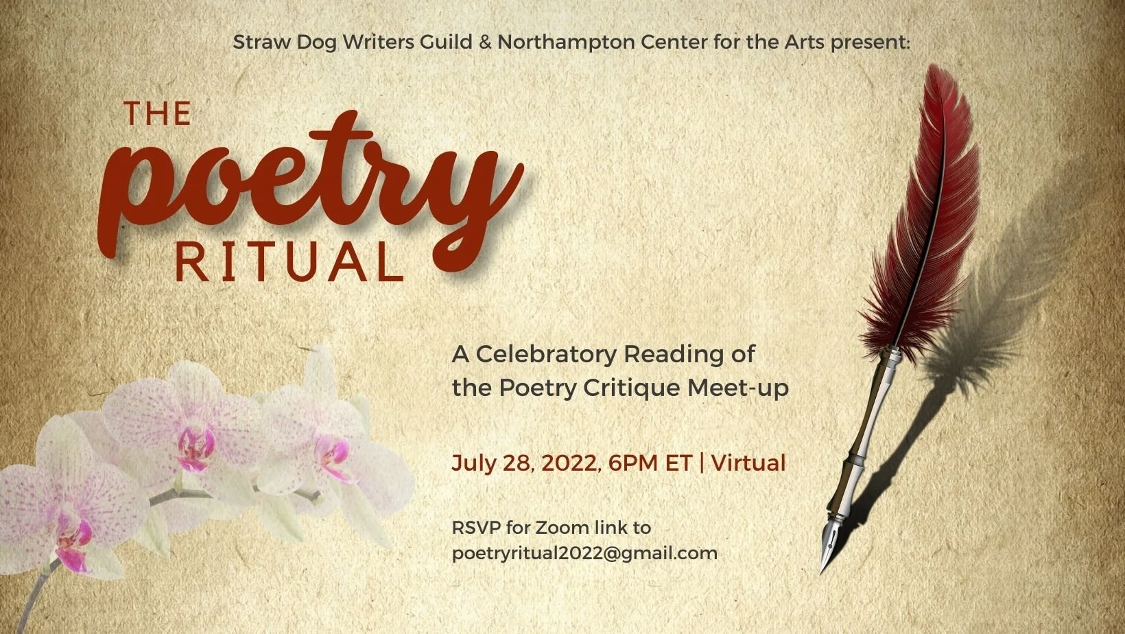 Poetry Critique Meet-up is a chance for poets to give and receive immediate constructive feedback on their poems by everyone in attendance. Moderated by translator and poet Michael Favala Goldman twice monthly, the meet-up has served hundreds of poets since its inception. Join Michael and other local poets on Thursday, July 28th for the third annual celebratory reading of poems workshopped in the meet-ups! RSVP for the Zoom link to poetryritual2022@gmail.com.