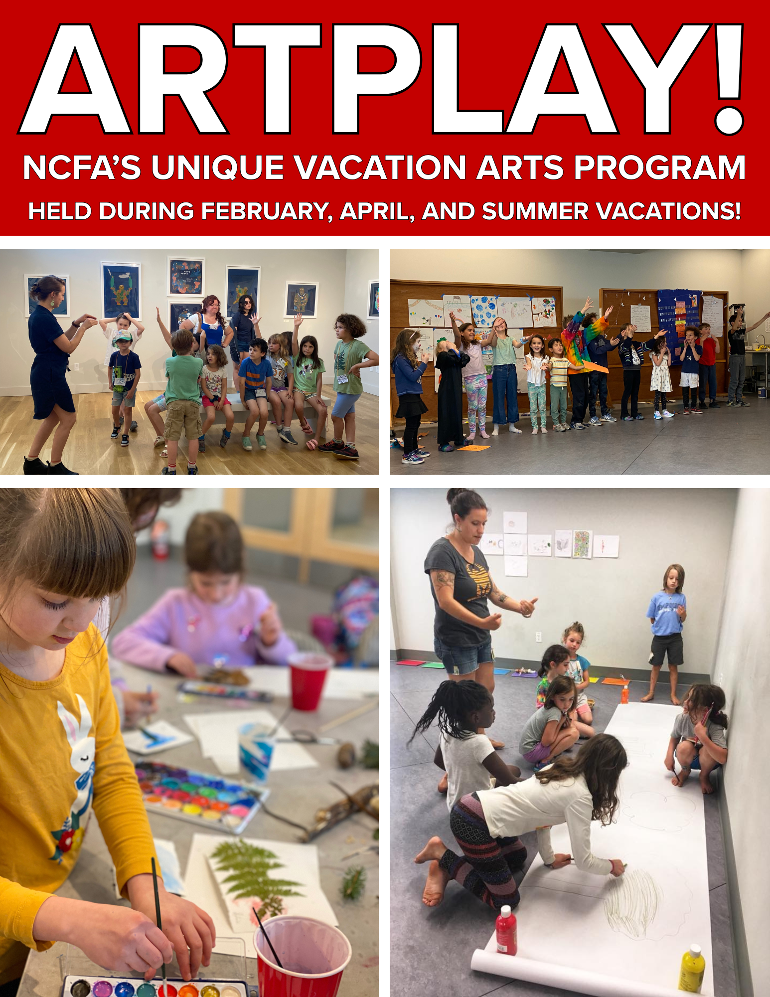 ONE WEEK SESSIONS OF ARTPLAY ARE HELD DURING FEBRUARY AND APRIL SCHOOL VACATIONS FROM 10:00AM-4:00PM.