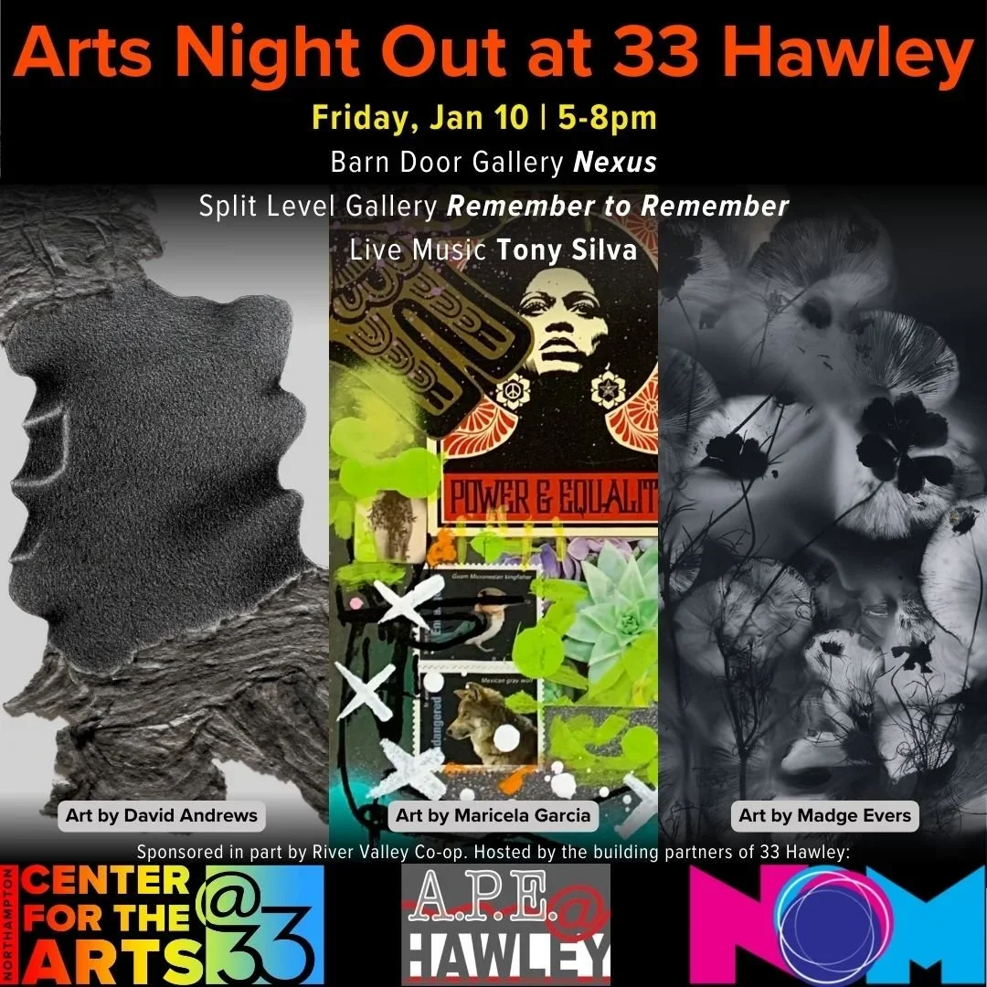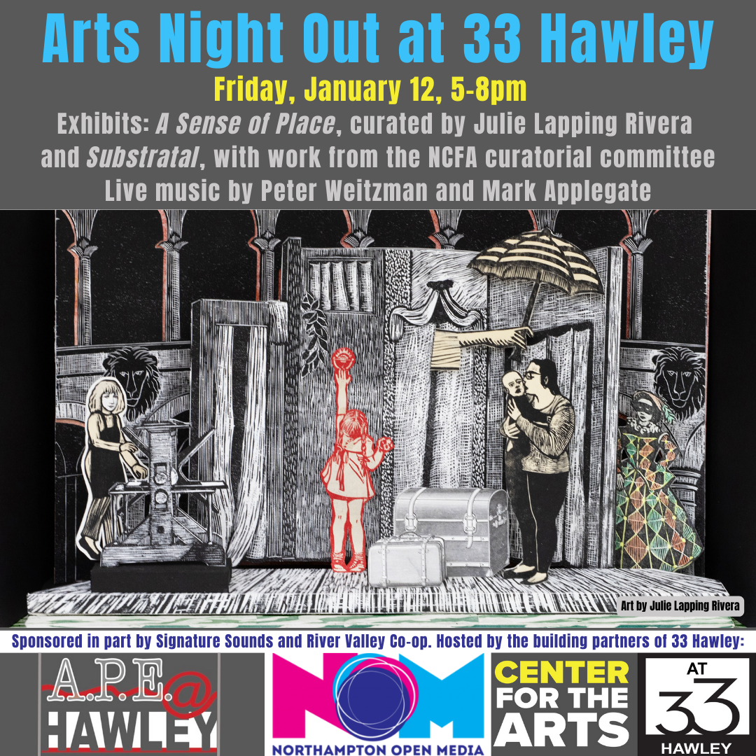 Please join the Northampton Center for the Arts, A.P.E. Ltd., and Northampton Open Media at 33 Hawley for an opening reception with refreshments and live music during Arts Night Out on Friday, 1/10, from 5:00-8:00 pm!