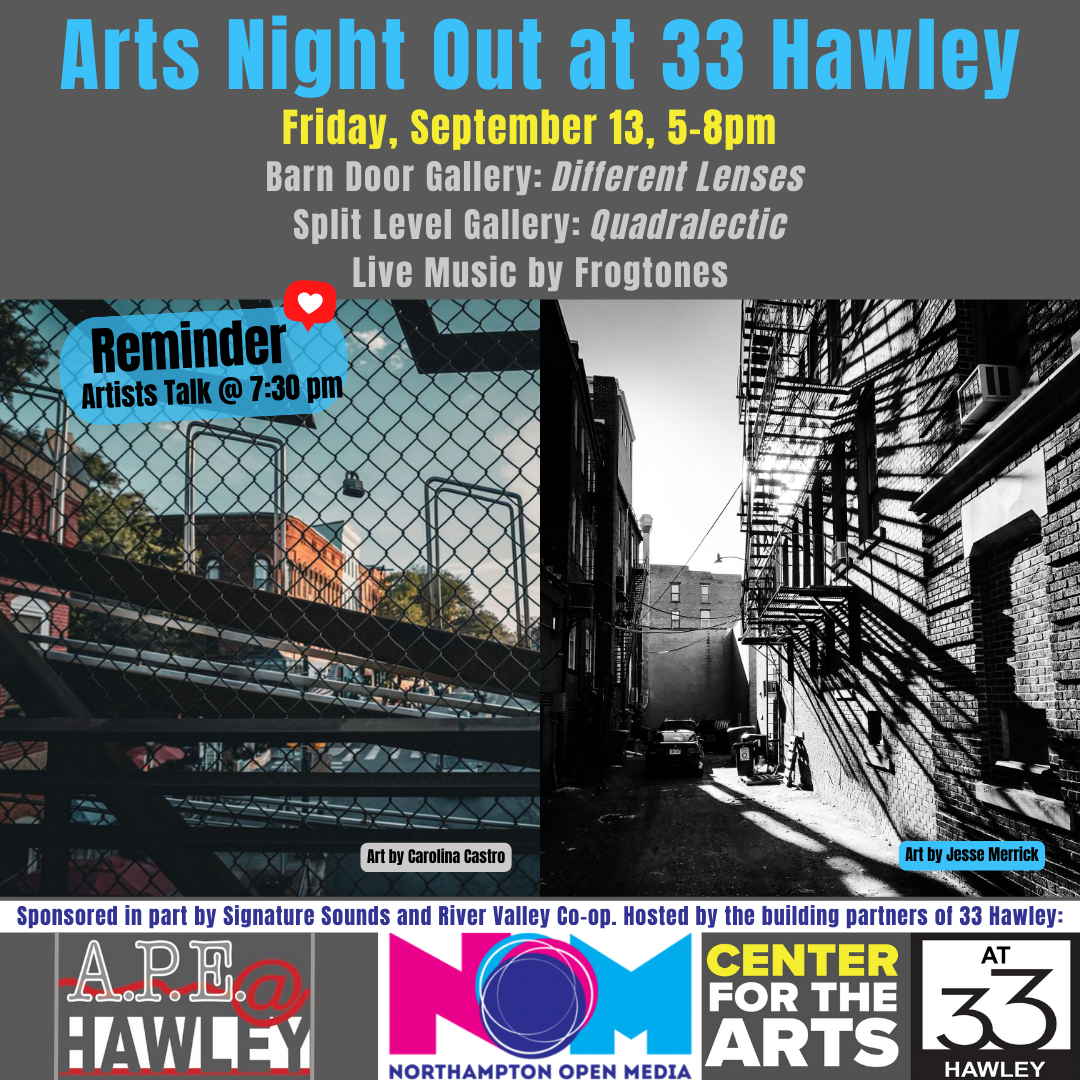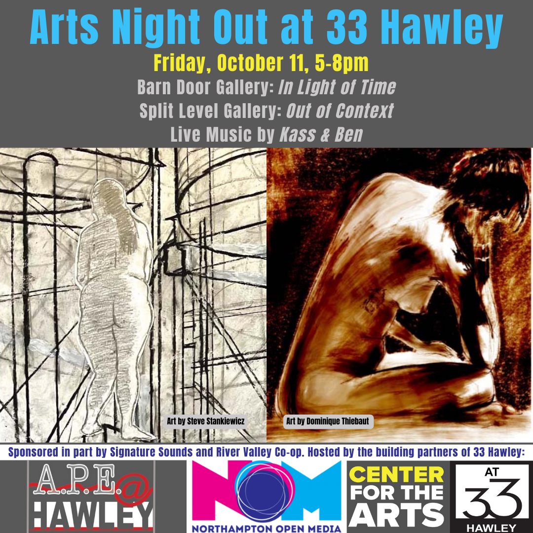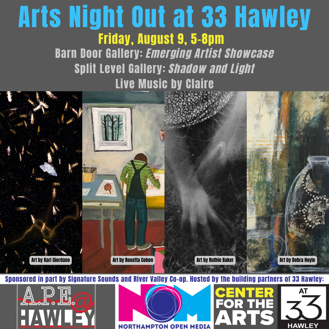 Please join the Northampton Center for the Arts, A.P.E. Ltd., and Northampton Open Media at 33 Hawley for an opening reception with refreshments and live music during Arts Night Out on Friday, 11/8, from 5:00-8:00 pm!