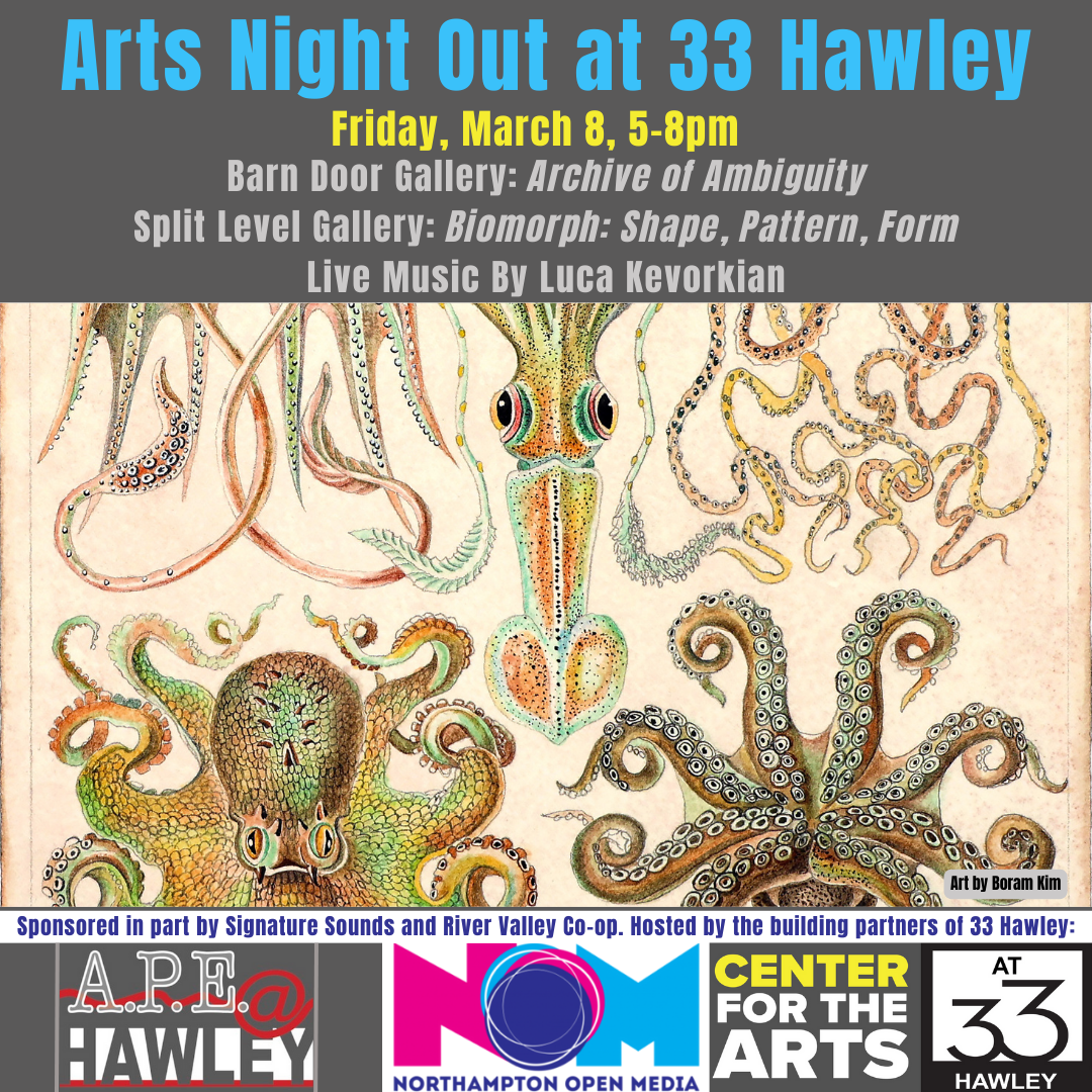 Please join the Northampton Center for the Arts, A.P.E. Ltd., and Northampton Open Media at 33 Hawley for an opening reception with refreshments and live music during Arts Night Out on Friday 3/8 from 5:00-8:00 pm! Archive of Ambiguity, featuring artwork by Boram Kim, can be seen in the Barn Door Gallery. Biomorph: Shape, Pattern, Form with works by Madge Evers, Laurie Miles, and Rachel Thern, can be seen in the Split Level Gallery.