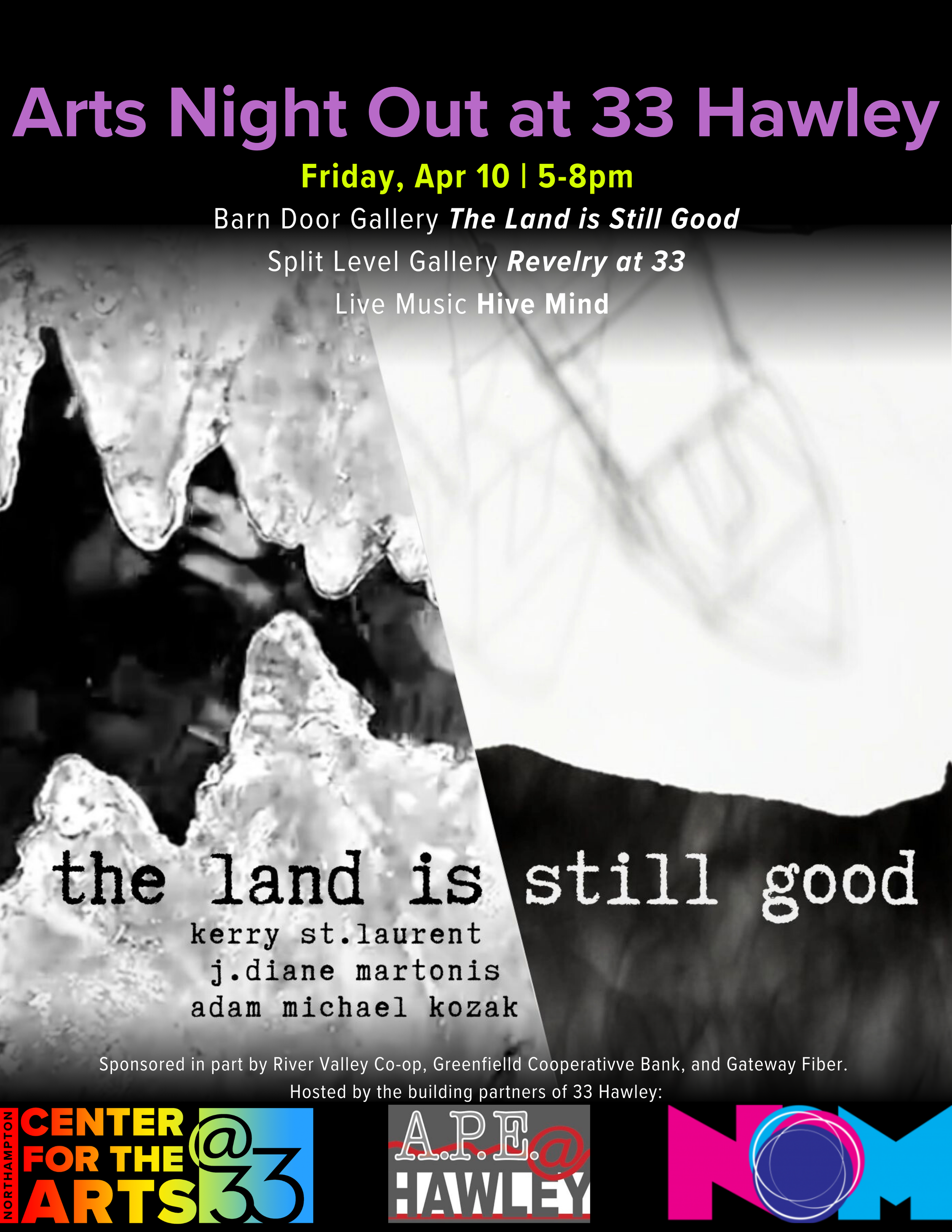 Please join the Northampton Center for the Arts, A.P.E. Ltd., and Northampton Open Media at 33 Hawley for an opening reception with refreshments and live music during Arts Night Out on Friday, 4/,10 from 5:00-8:00 pm!