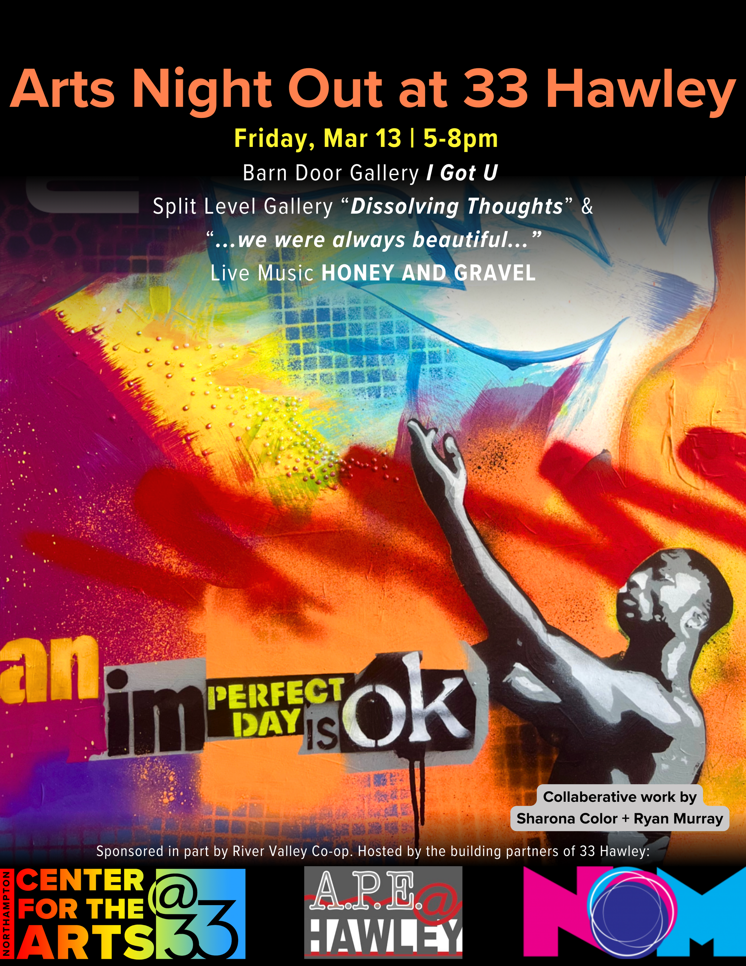 Please join the Northampton Center for the Arts, A.P.E. Ltd., and Northampton Open Media at 33 Hawley for an opening reception with refreshments and live music during Arts Night Out on Friday, 3/13 from 5:00-8:00 pm!