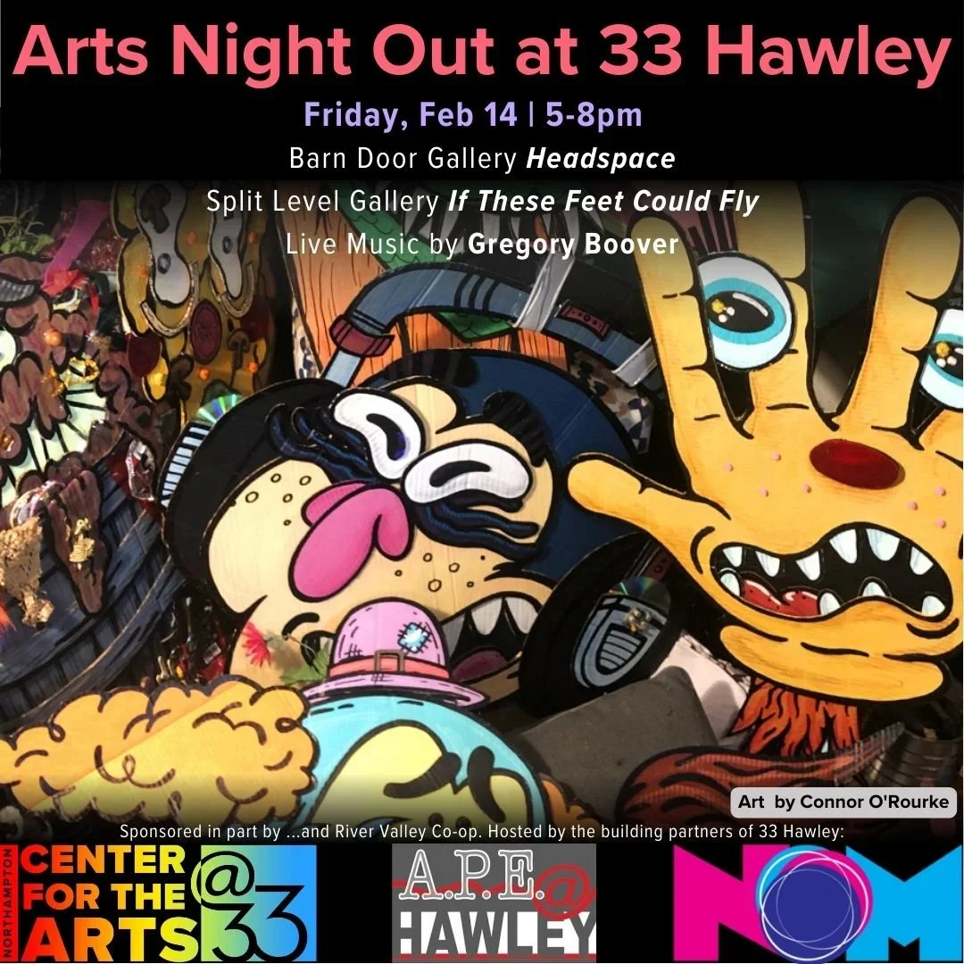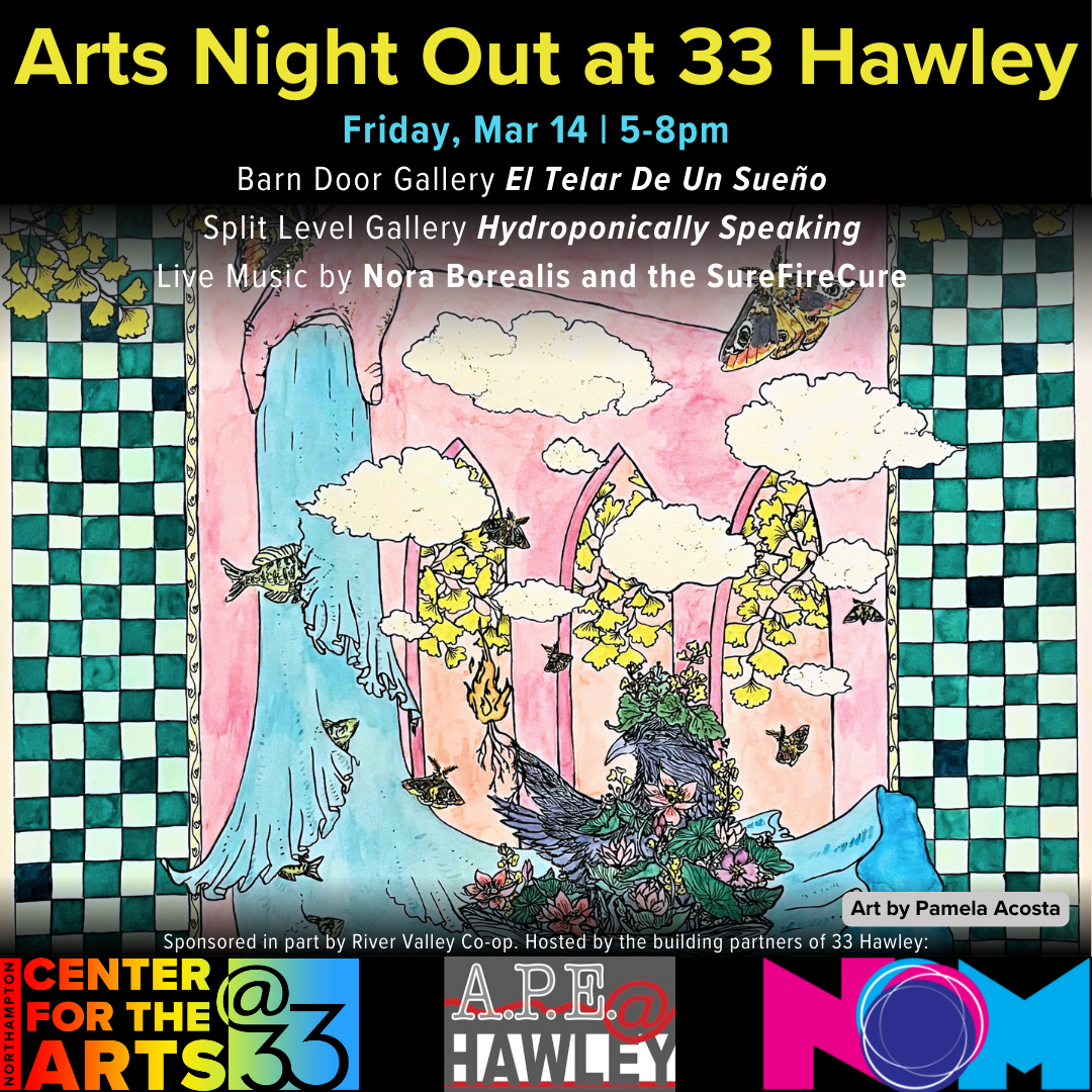 Please join the Northampton Center for the Arts, A.P.E. Ltd., and Northampton Open Media at 33 Hawley for an opening reception with refreshments and live music during Arts Night Out on Friday, 10/10, from 5:00-8:00 pm!