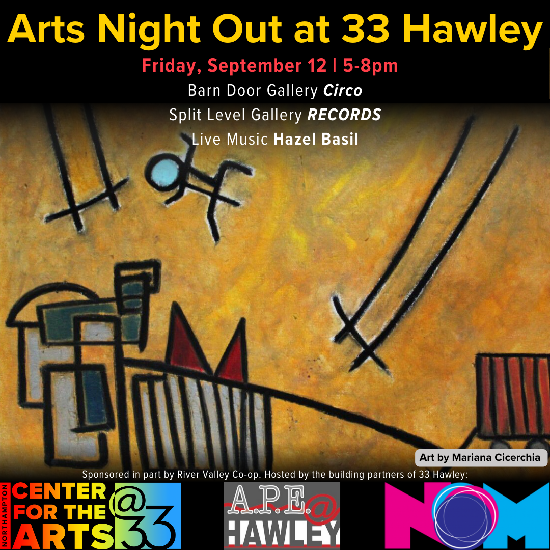 Please join the Northampton Center for the Arts, A.P.E. Ltd., and Northampton Open Media at 33 Hawley for an opening reception with refreshments and live music during Arts Night Out on Friday, 9/12, from 5:00-8:00 pm!