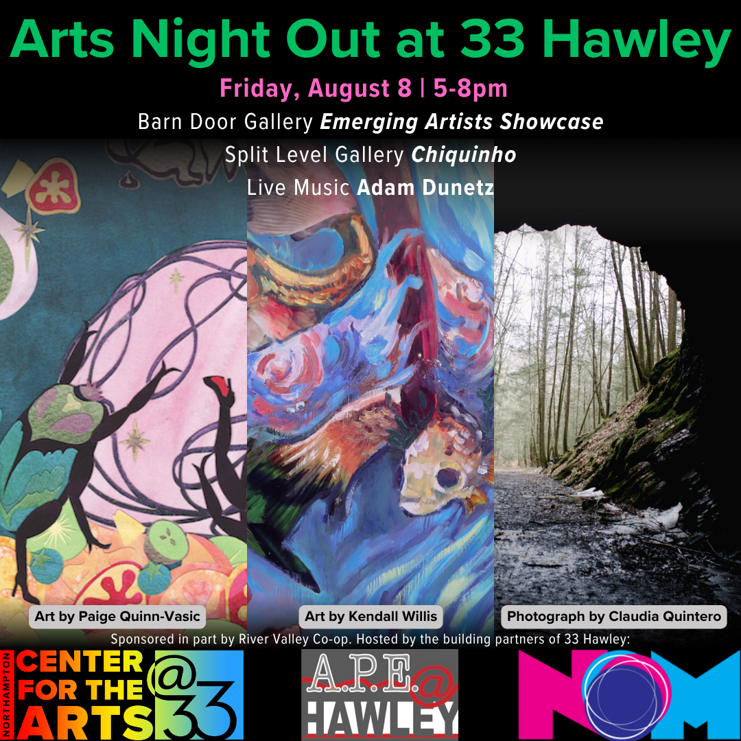 Please join the Northampton Center for the Arts, A.P.E. Ltd., and Northampton Open Media at 33 Hawley for an opening reception with refreshments and live music during Arts Night Out on Friday, 8/8, from 5:00-8:00 pm!
