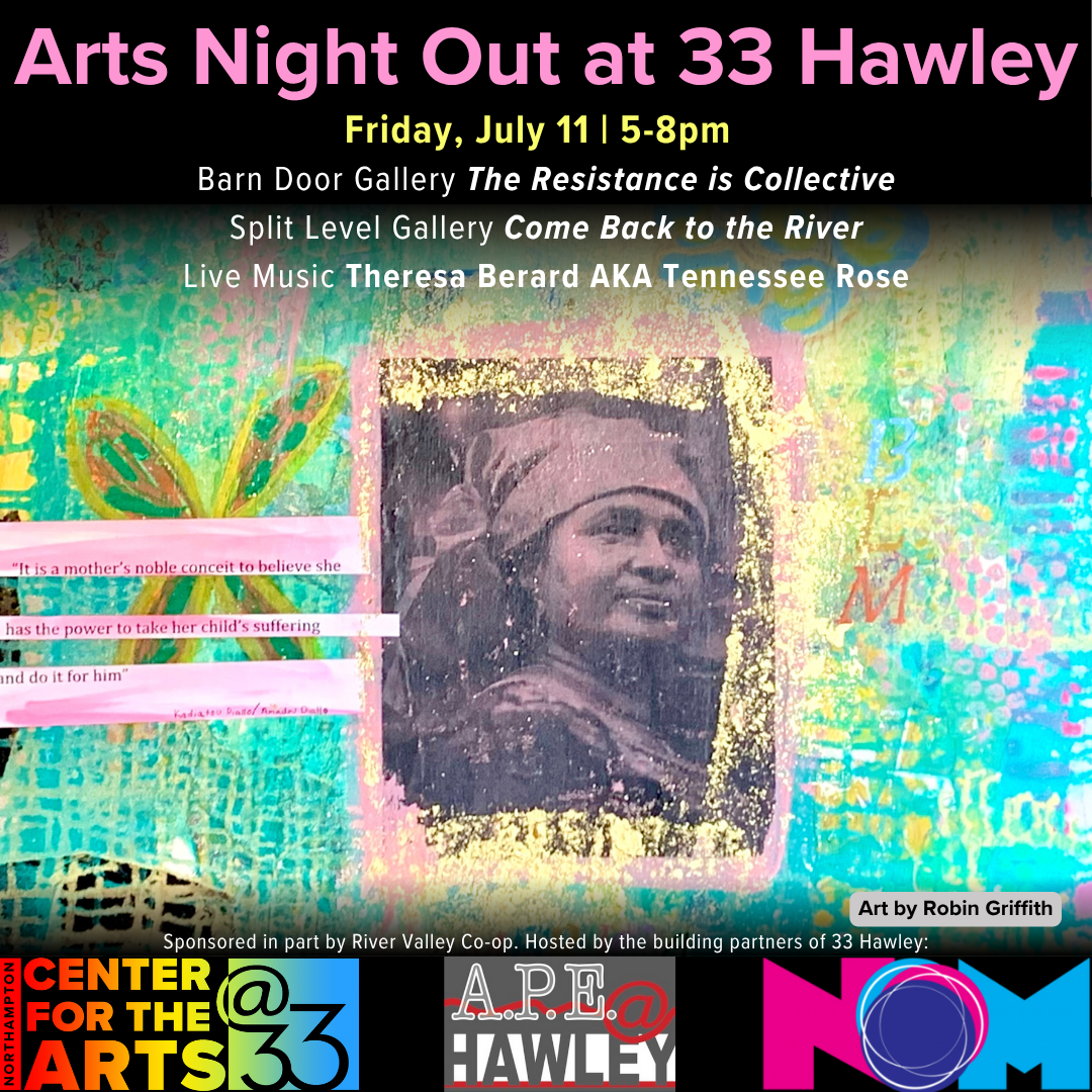 Please join the Northampton Center for the Arts, A.P.E. Ltd., and Northampton Open Media at 33 Hawley for an opening reception with refreshments and live music during Arts Night Out on Friday 7/11 from 5:00-8:00 pm!