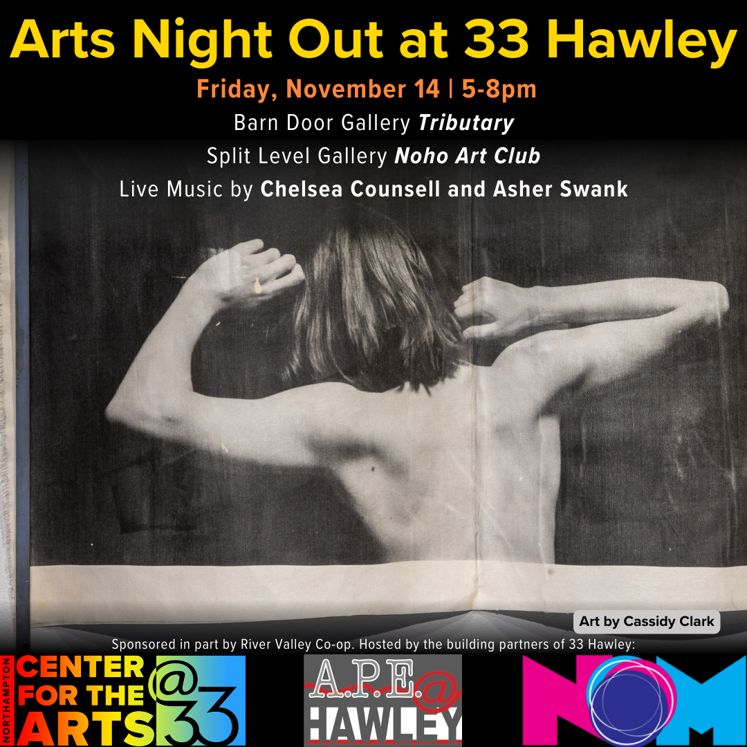 Please join the Northampton Center for the Arts, A.P.E. Ltd., and Northampton Open Media at 33 Hawley for an opening reception with refreshments and live music during Arts Night Out on Friday, 11/14, from 5:00-8:00 pm!