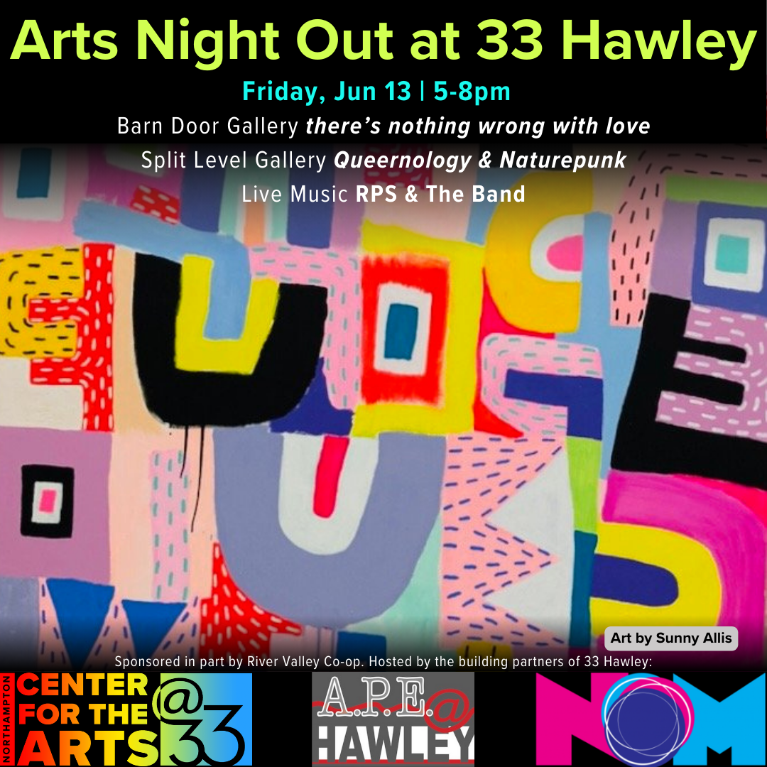Please join the Northampton Center for the Arts, A.P.E. Ltd., and Northampton Open Media at 33 Hawley for an opening reception with refreshments and live music during Arts Night Out on Friday, 6/13, from 5:00-8:00 pm!