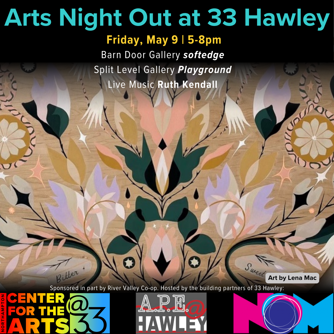 Please join the Northampton Center for the Arts, A.P.E. Ltd., and Northampton Open Media at 33 Hawley for an opening reception with refreshments and live music during Arts Night Out on Friday 5/9 from 5:00-8:00 pm!