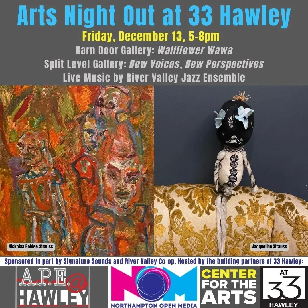 Please join the Northampton Center for the Arts, A.P.E. Ltd., and Northampton Open Media at 33 Hawley for an opening reception with refreshments and live music during Arts Night Out on Friday 12/13 from 5:00-8:00 pm!