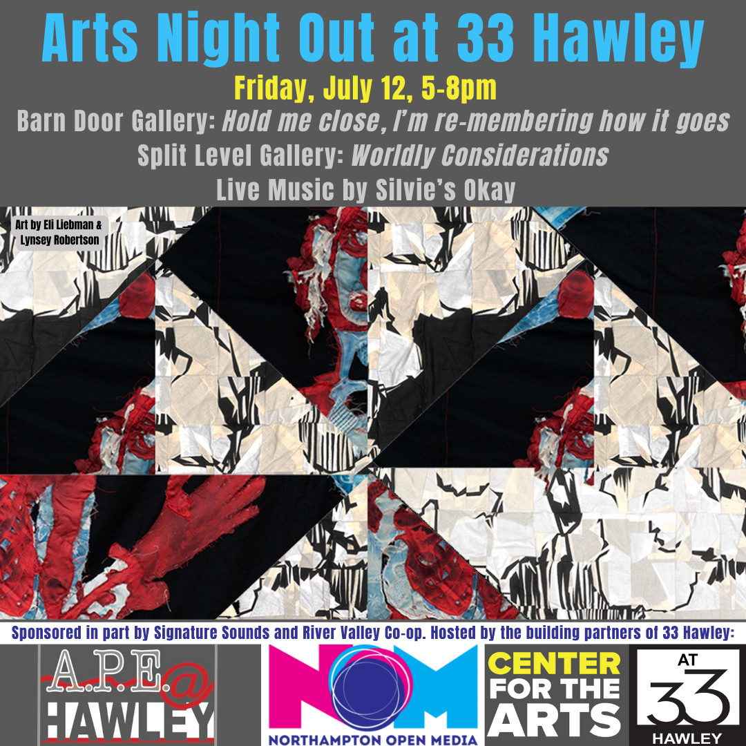Please join the Northampton Center for the Arts, A.P.E. Ltd., and Northampton Open Media at 33 Hawley for an opening reception with refreshments and live music during Arts Night Out on Friday, 7/12, from 5:00-8:00 pm! : Hold me close, I’m re-membering how it goes by Eli Liebman and Lynsey Robertson can be seen in the Barn Door Gallery. The works of Hold Me Close spring from the desire to question an unthinkable and unknowable world and self. The presented work - a body of quilts, a collaborative “newspaper,” and a few ceramic sculptures - embraces a wide range of disparate parts into familiar and quotidian containers.