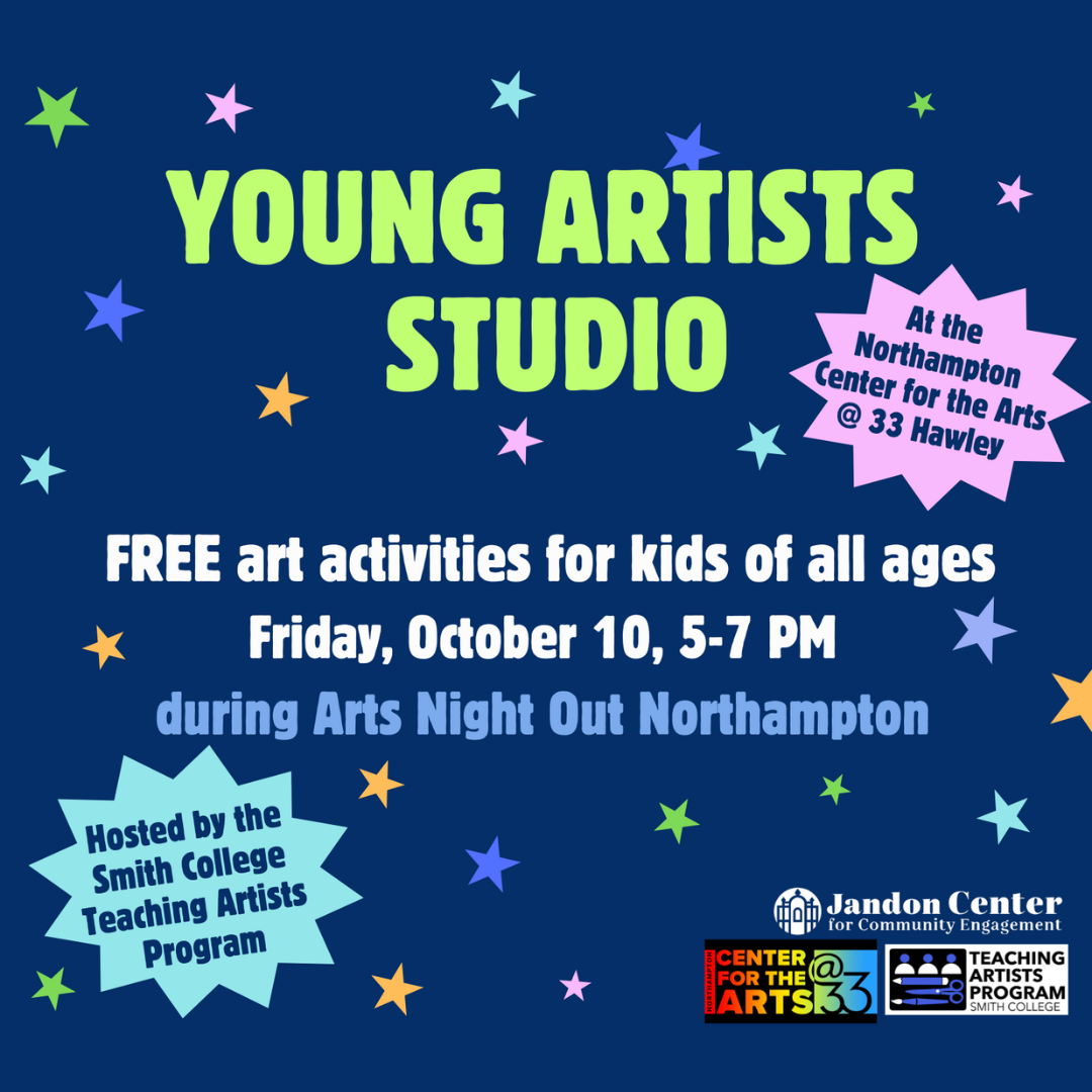 About the event:Young Artists Studio is a series of events at the Northampton Center for the Arts being offered in collaboration with the Teaching Artists Program (TAP) at Smith College through the Jandon Center Education Initiative. TAP is a new initiative where Smith College students teach visual arts in community based and school contexts with mentorship and guidance from dedicated art educators. The next Young Artists Studio event at NCFA is on Saturday, November 9, 2024, 10 AM - Noon.