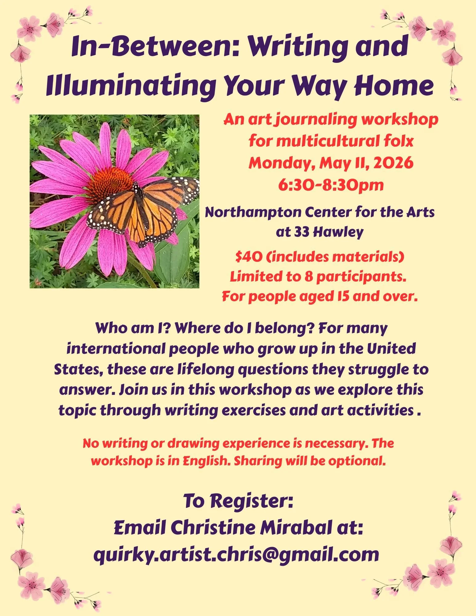 This workshop is for people from international countries who were raised in the United States but don't feel at home in their family's culture or their new adopted American culture. They're somewhere in between. We'll explore this internal struggle through writing exercises and art activities. (No writing or drawing experience is necessary). Participants will be provided with blank journals and other materials to create visual clues and guides for themselves. Along the way, they may discover that being in the middle is okay. Participants are encouraged to bring a small, personal item such as a photo, a family recipe, a piece of jewelry, or other keepsake that they can use as inspiration in a writing exercise.