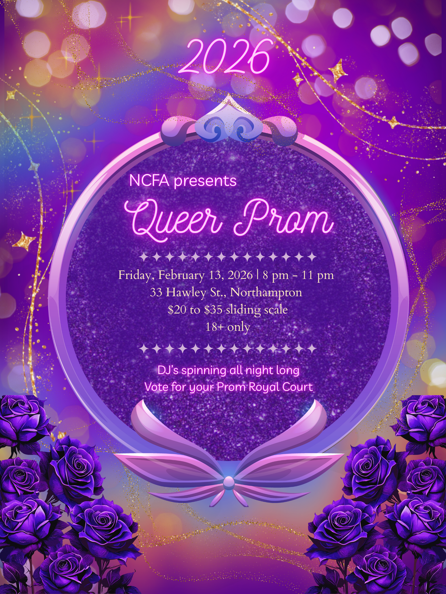 Every dollar raised at Queer Prom goes directly to NCFA’s Community Funds, continuing to fuel access, inclusion, and creativity for our neighbors. The Northampton Center for the Arts Community Fund enables local residents to attend programs and rent Center spaces, regardless of financial circumstances. Whether it’s subsidized space rentals for non-revenue-generating events or scholarships for arts programming, this fund removes barriers and opens doors. By joining us for Queer Prom, you’re not just celebrating queer joy, but you’re helping to ensure everyone in our community can experience the transformative power of the arts in Downtown Northampton.