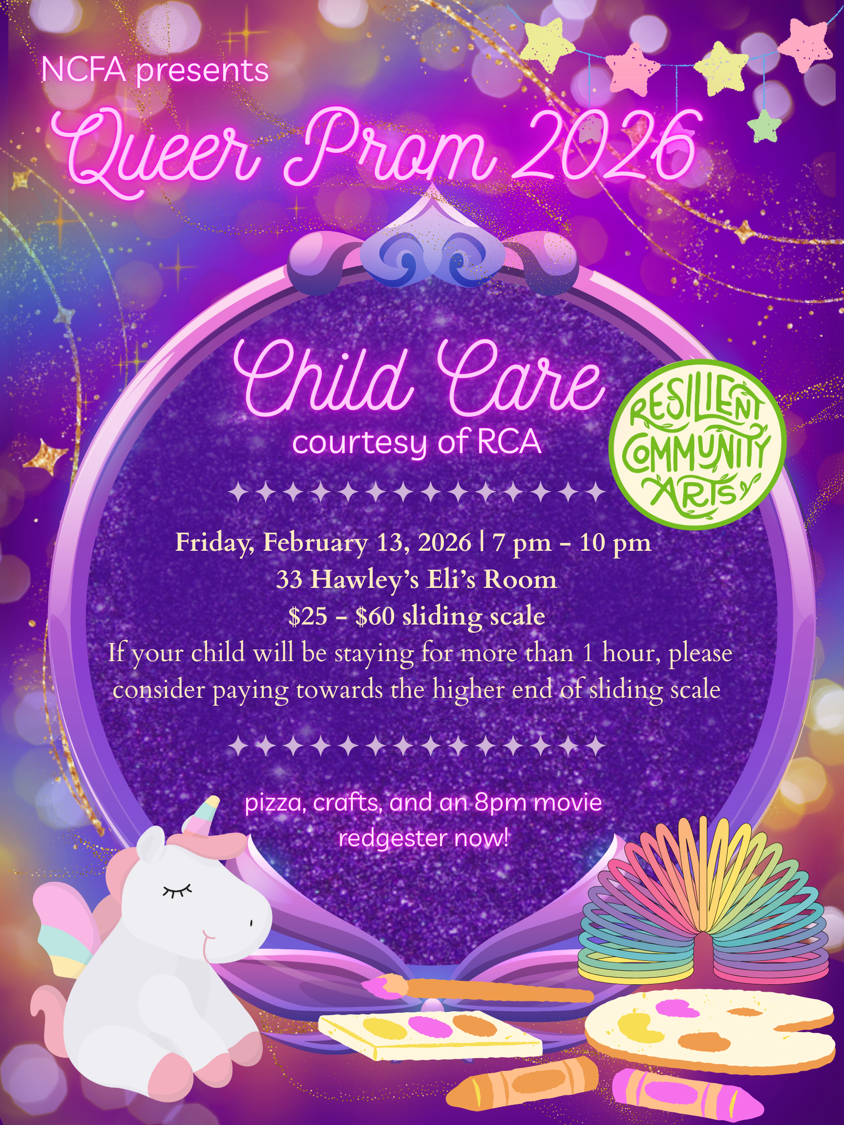 Your kiddo can enjoy crafts, pizza, and, starting at 8 pm, a G-rated movie screening while you enjoy Arts Night Out and NCFA's Queer Prom!