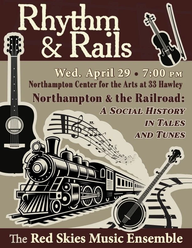 Rhythm & Rails, a multimedia performance written and directed by local public history playwright Trudy Williams, draws to the stage some of the Valley’s most talented musicians and actors to animate aspects of the complex social history of railroads in America. At the center of Rhythm & Rails is Northampton’s railroad history, but the performance takes us to other parts of New England and the country using a blend of railroad-themed music, narration, theatrical cameos, and archival images. The arrival of the railroad in the United States in the mid-nineteenth century profoundly affected the nation’s history. Here in Northampton and across the country, railroads changed the pace of life, the perception of space and time, the movement of people and goods, and the country's economic, technological, and social history. The impact of railroads on the lives of people across America was recorded in letters, photographs, literature, and in thousands of songs—from American roots, folk and rag time to blues, jazz, pop, and rock.