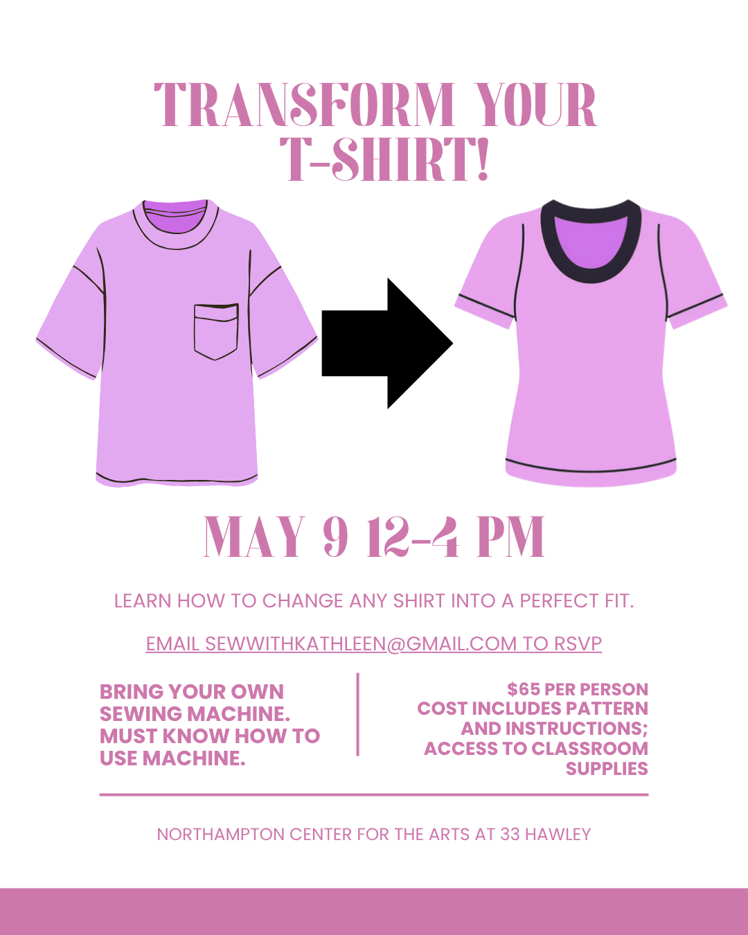 Learn how to turn any oversized t-shirt into a perfect fit with this sewing class. Great for any level of sewist-- must be able to use your sewing machine. Students will be provided with a pattern that they can take home to use on any future knit shirt or sweater they want to adjust.