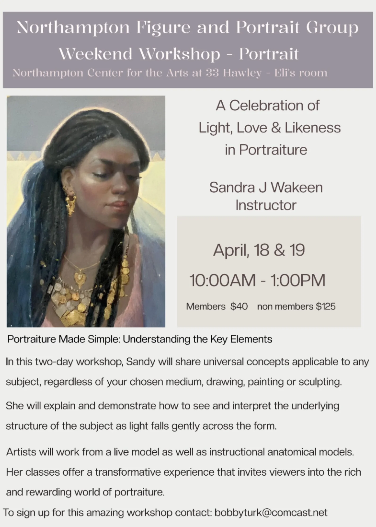In this two-day workshop, Sandy will share universal concepts applicable to any subject, regardless of your chosen medium, drawing, painting or sculpting. Artists will work from a live model as well as instructional anatomical models. Her classes offer a transformative experience that invites viewers into the rich and rewarding world of portraiture.